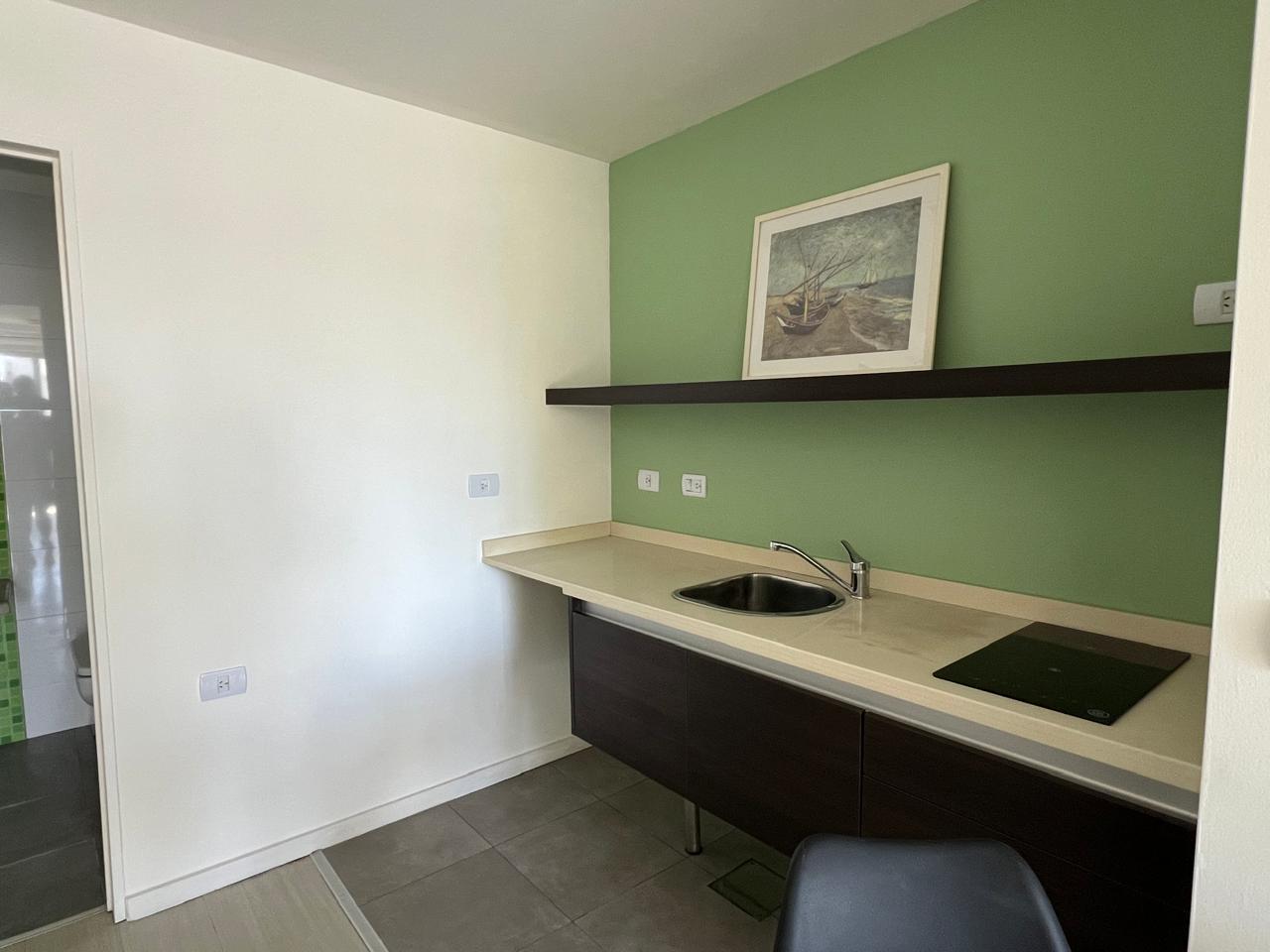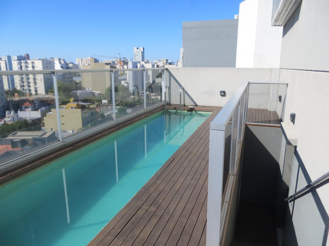 Tiene 34 m2 de superficie, con estar con balcón, cocina integrada con 1 hornalla, lugar para colocar heladera. Baño grande con ducha. Edificio con pileta último piso (pequeña) Solarium, ducha escosesa y sauna. Salón de usos múltiples. 5 años de antiguedad.